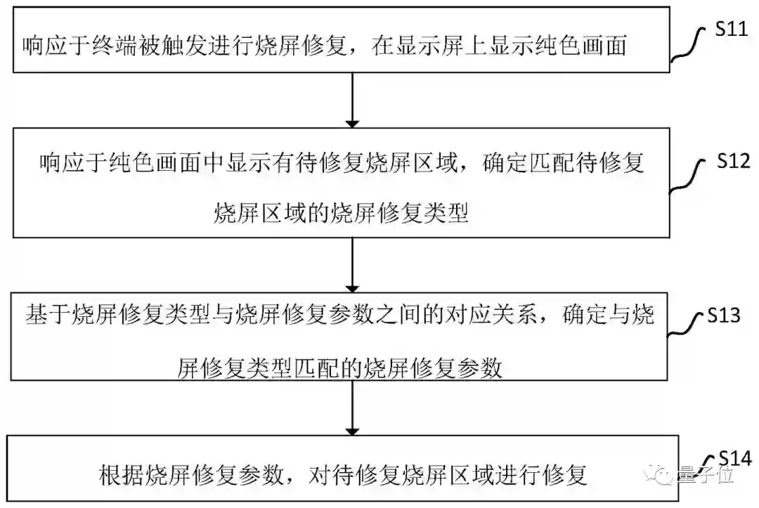 据介绍,该专利中的烧屏修复方法包括:响应于终端被触发进行烧屏修复,在显示屏上显示纯色画面,从而显示有待修复烧屏区域,确定匹配的烧屏修复类型;基于修复类型与修复参数之间的对应关系,确定匹配的烧屏修复参数;根据烧屏修复参数,对待修复烧屏区域进行修复。