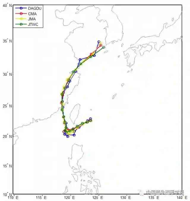用偏差角梯度分布均匀性算法(DAGDU,Deviation Angle gradient distribution uniformity)计算单个热带气旋并画出相对应路径以及CMA、JMA和JTWC的年鉴路径。如下图表示2014年20号超强台风鹦鹉(10月30日0时—11月6日12时)的定位结果: