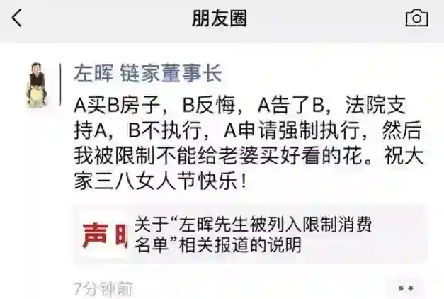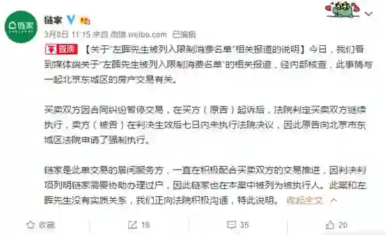 这个话题还是要从左晖入限制消费名单说起。2018年3月5日,北京市东城区人民法院发布一条限制消费令,对北京链家房地产经纪有限公司及实际控制人左晖采取限制消费措施。