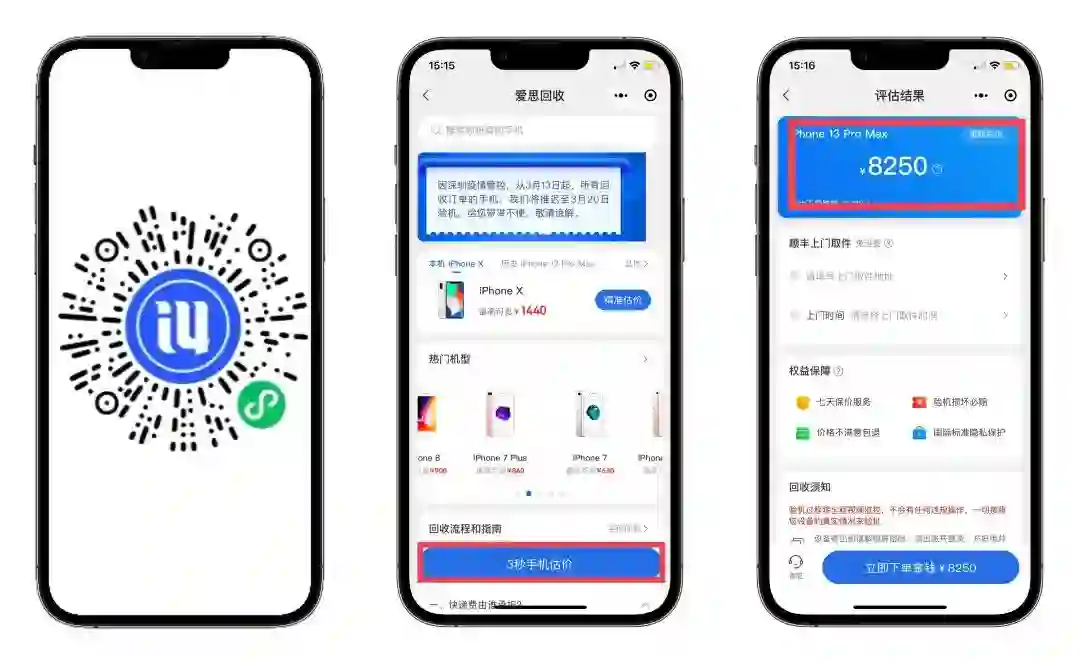 扫描下⽅⼆维码,进⼊爱思⼩程序点击⼿机估价,选择您想回收的⼿机机型、内存、以及成⾊等,即 可⽴即获取线上报价,不满意报价也是可以取消的哟~