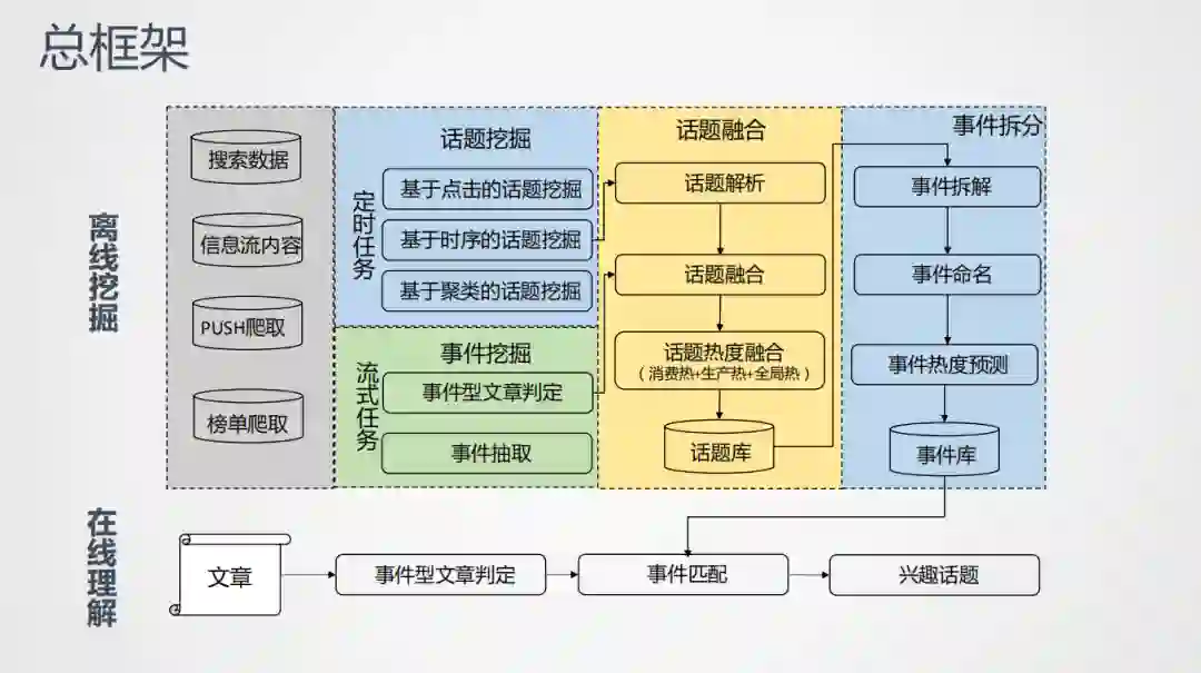 离线挖掘流程:先是资源引入,有3个不同的端,腾讯看点浏览器、qq浏览器、qq里的腾讯看点频道,接入丰富的数据之后,通过话题抽取,来提取热点特征,进行话题融合,把挖掘到的结果聚类成话题,再把话题拆分成对应的事件。