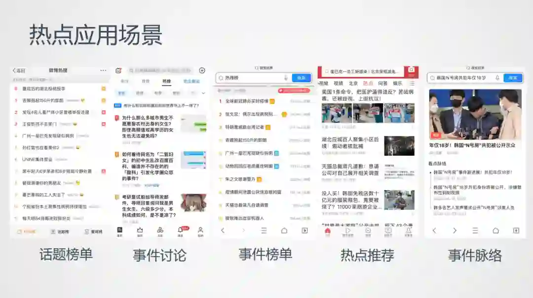 热度合理性问题。热度值是热度的重要特征,不同的数据源的事件热度各有不同,比如微博热搜榜当时有"钱峰又胖了"的话题,排在微博热搜榜很高的位置上,但是由于不同媒体的受众不同,在看点这边就很少有文章报道或者有用户去阅读。