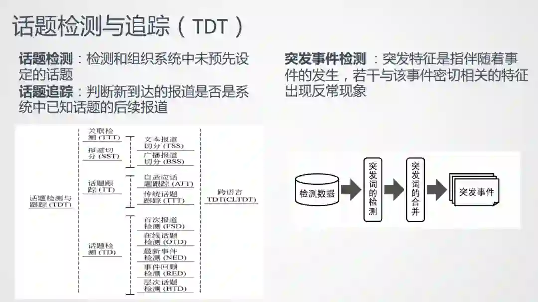 突发事件监测:TDT为我们处理海量数据提供了很多新的解决思路,之后衍生出来了突发事件检测任务,值得关注。突发特征指的是伴随着事件的发生,若干与该事件密切相关的特征出现反常现象,比如文档、词语的爆发,比如南方下暴雨,暴雨这个词就会比去年或者前几个月的时序有明显的不同,最近是一个显著爆发的特征。我们可以通过检测突发特征来发现事件,这类研究目标与TDT任务不同,不再局限于传统的新闻报道,可以针对多类型的数据,比如微博、搜索、视频数据,受此输入的影响,我们将时序分析方法和话题聚类相结合,来提升热点挖掘的效果,以上方法都能很好地指导我们进行热点挖掘的工作。