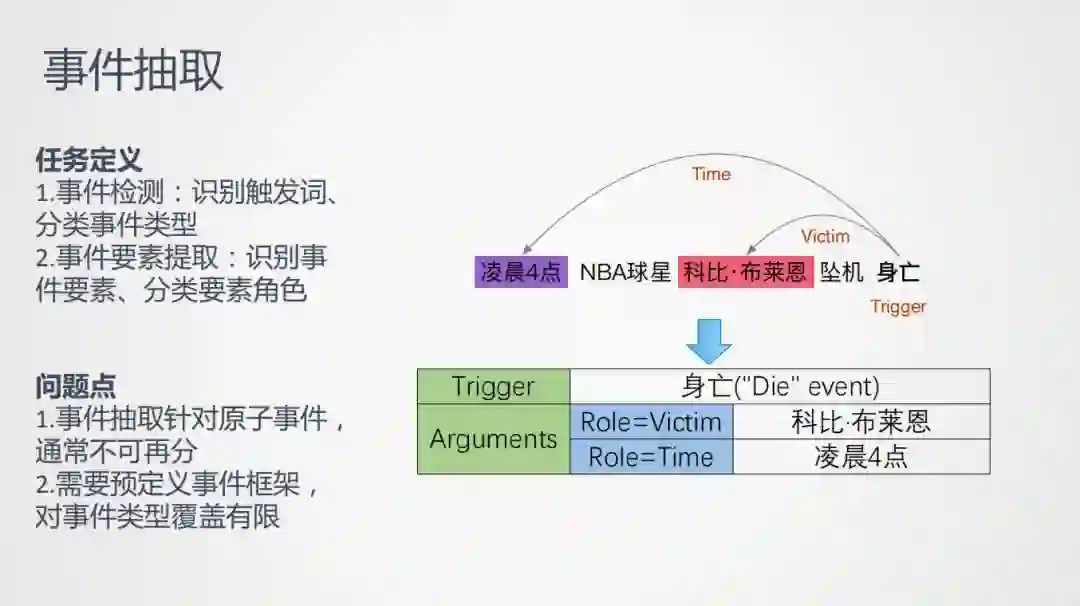 作为信息抽取的一个重要任务,事件抽取是从一个无结构化的文本中自动抽取出来结构化的知识。以ACE任务为例,事件抽取可以分为事件检测和事件要素提取。事件检测是识别句子中的触发词trigger,这个词是描述时间的核心动作,然后根据预先定义好的框架,进行事件类型分类,因此事件分类是一个封闭集合。我是科比的粉丝,专门研究过科比不幸遇难时的相关报道,以科比去世为例,这里"凌晨四点,NBA球星科比布莱恩坠机身亡",可以识别出trigger词为"身亡",事件类型分类为die – 死亡事件类型,对应的事件要素是:event frame,包括:施害者、受害者、事件、地点等。通过事件提取的方式,能提到时间是"凌晨四点",受害者是"科比·布莱恩",把受害者和时间对应起来。这就是一个比较完整的事件抽取过程。