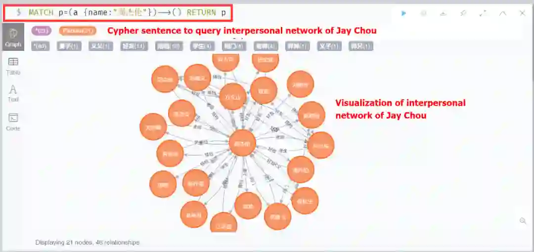 我们的人物百科知识图谱以百度百科为数据基础,以人物为中心主题,图谱共计包含2,480,097个人物实体和422,612,281个相关三元组。图谱可借助导入neo4j数据库形成图形查询界面,以帮助用户理解和挖掘个人信息和人际关系,也有助于进一步支持相关应用。下图展示了用户使用我们知识图谱时的一个可视化界面。