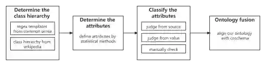 而为了保证数据质量和节约成本,我们半自动地构建了本体。下图说明了本体构建的过程,它包括决定类型层次、决定属性、决定属性类型、本体融合。在本体融合的过程中,我们参考了Cnschema.org。