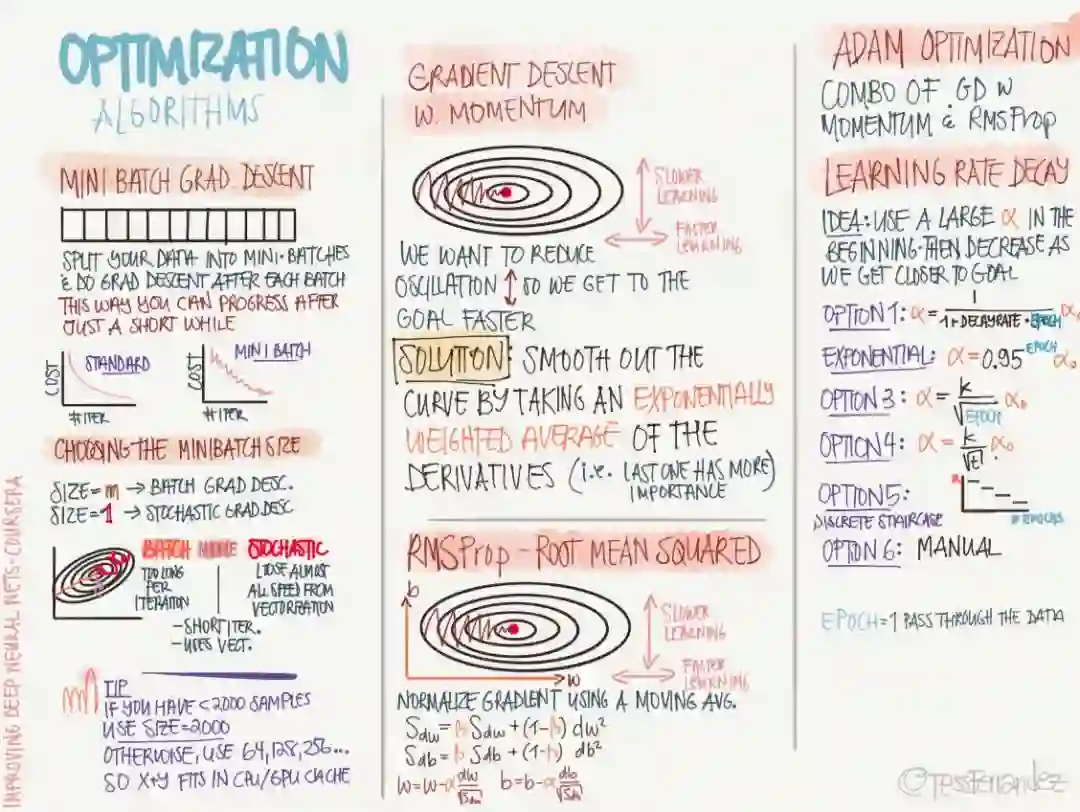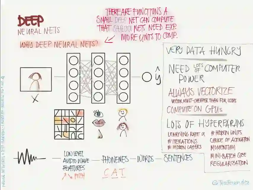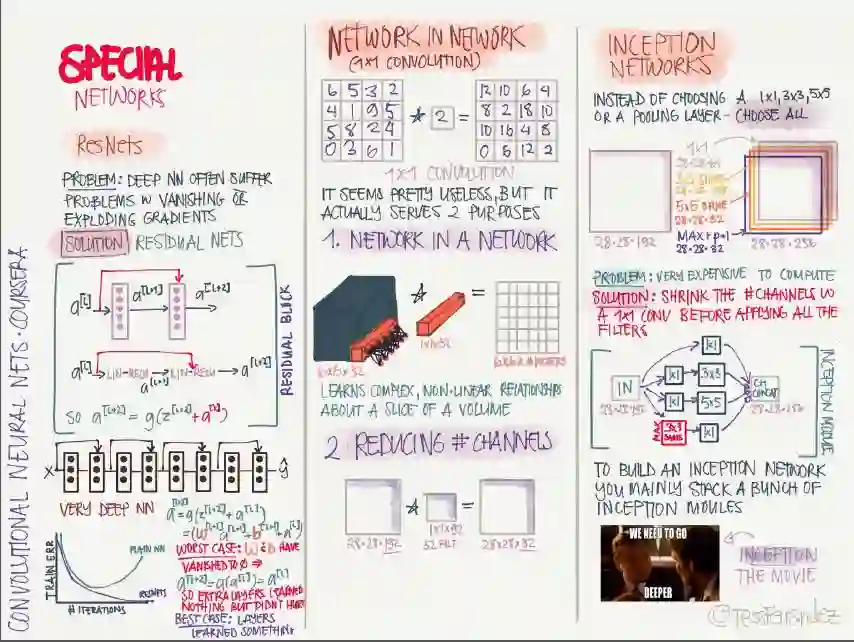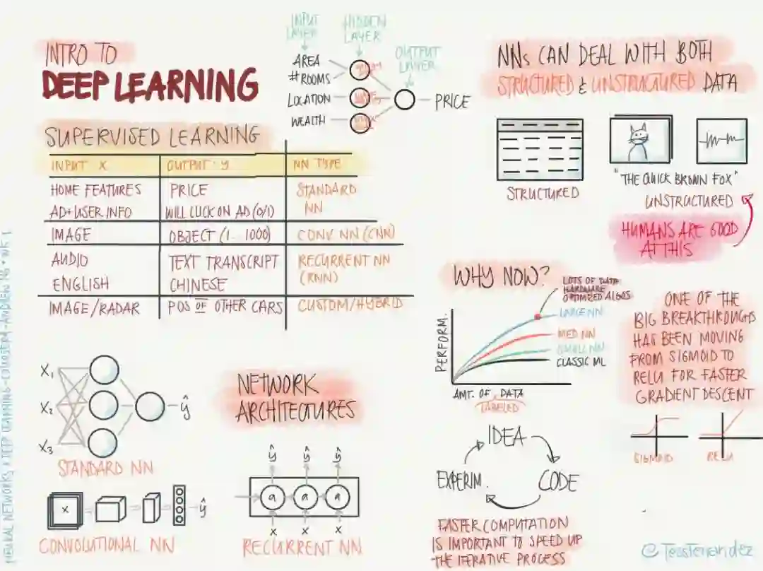 吴恩达在推特上展示了一份由 TessFerrandez 完成的深度学习专项课程信息图,这套信息图优美地记录了深度学习课程的知识与亮点。因此它不仅仅适合初学者了解深度学习,还适合机器学习从业者和研究者复习基本概念。机器之心认为这不仅仅是一份课程笔记,同时还是一套信息图与备忘录。下面,我们将从深度学习基础、卷积网络和循环网络三个方面介绍该笔记。