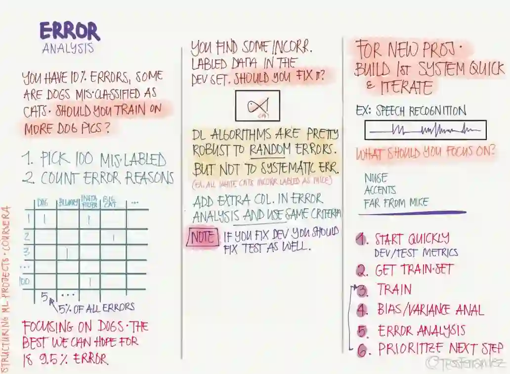 上图展示了三个分割数据集及其表现所需要注意的地方,也就是说如果它们间有不同的正确率,那么我们该如何修正这些「差别」。例如训练集的正确率明显高于验证集与测试集表明模型过拟合,三个数据集的正确率都明显低于可接受水平可能是因为欠拟合。