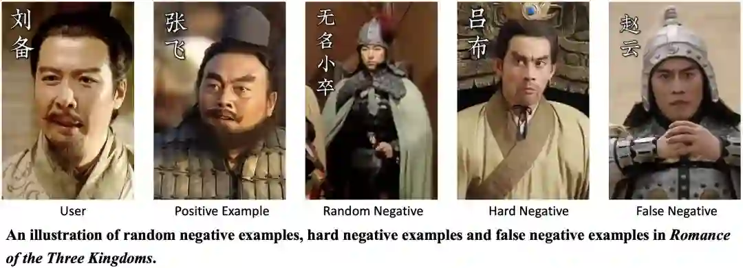强负例可能增进模型的训练效果,但至坚易断,过强易折,强负例超过一定界限后可能会采到未来的正例。对于当前的训练而言,这种样例在学术中被称作伪负例 (false negative)。也就是说,如果将刘备很有可能感兴趣的赵云作为与张飞配对的负例, 非但不能带来正向激励,有时甚至会对模型造成负面影响。