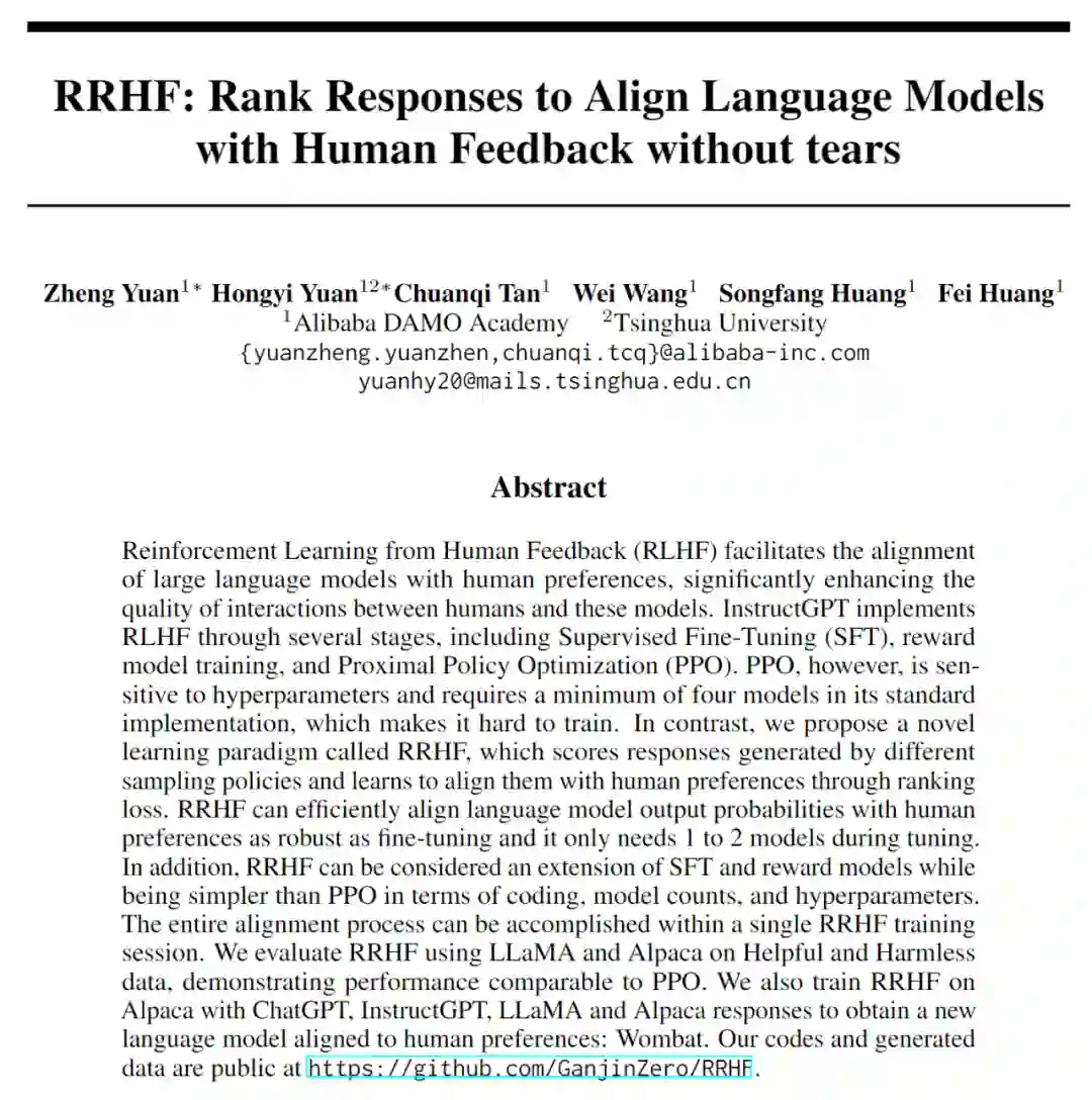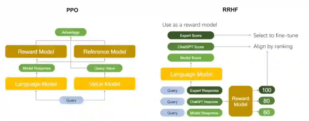 RRHF 算法可以有效地将语言模型输出概率与人类偏好对齐,并且在微调期间只需要 1 到 2 个模型。相比之下,PPO 需要 4 个模型:微调的语言模型,参考语言模型,奖励模型和价值模型相互配合。在实际的训练中,更少的模型数量可以帮助减少显存的占用,使得 RRHF 可以更高效地利用计算资源,并扩展到更大规模的模型上进行训练。