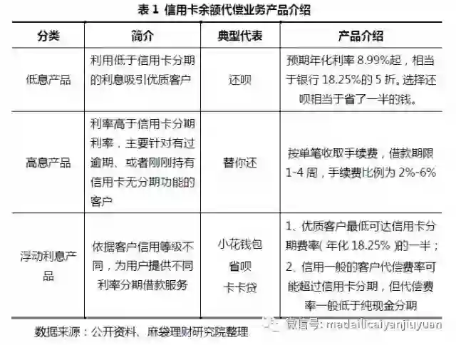 2015年4月维信金科推出卡卡贷,2015年6月拉卡拉旗下替你还和萨摩耶金服旗下省呗上线,2015年8月还呗成立,2016年年初,中腾信旗下小花钱包推出信用卡余额代偿产品,2016年6月小赢科技成立小赢卡贷,2017年包银消费金融公司包你还开始宣传。