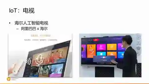 除了自己做魔盒以外,阿里也跟行业里做电视的龙头一起成立合资公司,一起把我们的内容、服务,我们的语音技术打包,把刚才的盒子装到电视机里面去。就像我们看到的海尔的人工智能电视。从前一代的摇控器的方式到刚刚在上海家博会发布的下一代的海尔-阿里的第五代人工智能电视,通过远距离的远场语音交互,免唤醒的方式,还融合识别声纹,来识别年龄,过滤对小孩子的不良内容等等这些技术,我们逐步地在家庭娱乐的环境里应用智能语音交互。