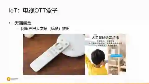 在这张大图底下,阿里自己推出了自己的OTT电视盒子,这个叫天猫魔盒,像刚才讲的,既然讲互联网内容和服务,天猫大文娱有优酷这么好的内容,所以需要一个端能够触达消费者,其中一个端就是魔盒。魔盒它是一个可以用语音跟盒子进行交互的IoT终端。因为现在大家知道在家里看电视的老人小孩很多,怎么能够在这种场景下帮助他们来寻找他们想看的东西,这个语音当然是很自然的、很便捷的手段。