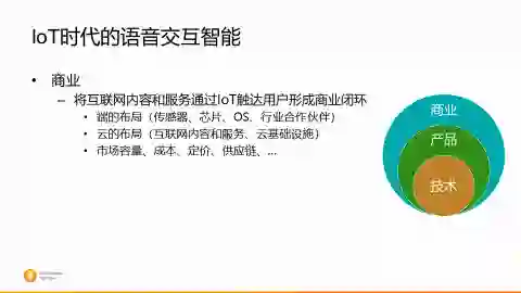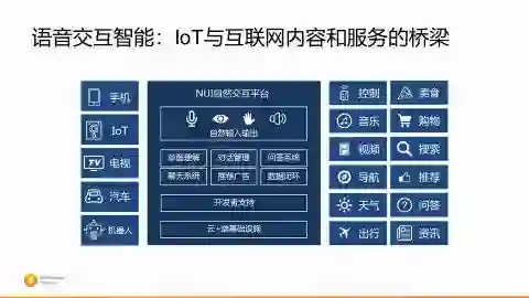 当我们有了这么多的互联网的内容和服务以后,接下来一个重要的问题就是怎么能够更多地使得好的内容,好的服务能够触达千千万万的消费者。它的触角就是最左边的IoT的端,无论是最传统的手机还是像现在的IoT设备,像智能音箱还有我们的智能电视,智联网汽车,以及机器人等等,我们希望是通过这些端,把我们在互联网上的内容和服务带给我们的消费者。中间的桥梁和媒介就是自然的人机交互界面,不管是语音的交互,然后计算机视觉的交互,以及这些东西结合起来的多模态交互等等。我们始终就是在拼这张大图,研发中间的技术,然后做这么一个桥梁。