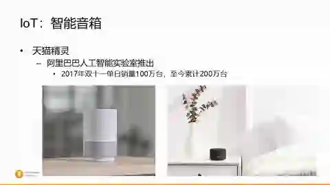 在这张大图下,天猫精灵的智能音箱,非常漂亮的这么一款音箱,前不久刚发布了黑色的小音箱。这个就是阿里集团的人工智能实验室的作品。去年双11的时候,也是一天之内卖了一百万台,到今天一共卖了累计200万台的销量,通过这个端触达到我们的用户。