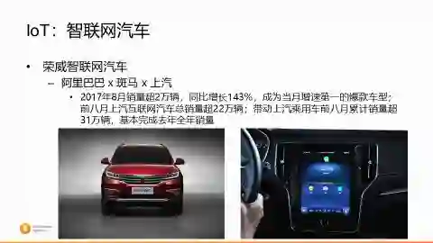 智联网汽车,阿里跟国内的汽车制造领域的龙头上汽集团,一起去投资成立了斑马网络,做汽车里面的智联网。其中除了地图以外,很重要的是让你在开车手握方向盘不方便的时候,还能跟你的车做直接的语音交互。现在走进4S店,同样的SUV,同样的价位,它的发动机和变速箱各种参数都是差不多的,但是当你今天走进荣威的4S店,4S店的销售一定会请你坐上这台车,然后展示斑马系统,然后对它用语音说我要看星星,突然之间所有的天窗都会打开,体现出这样的智能。