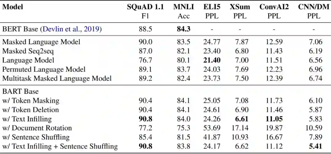 可以看出使用文本填充方案(Text Infilling)的BART战绩斐然。从中可以得出以下结论: