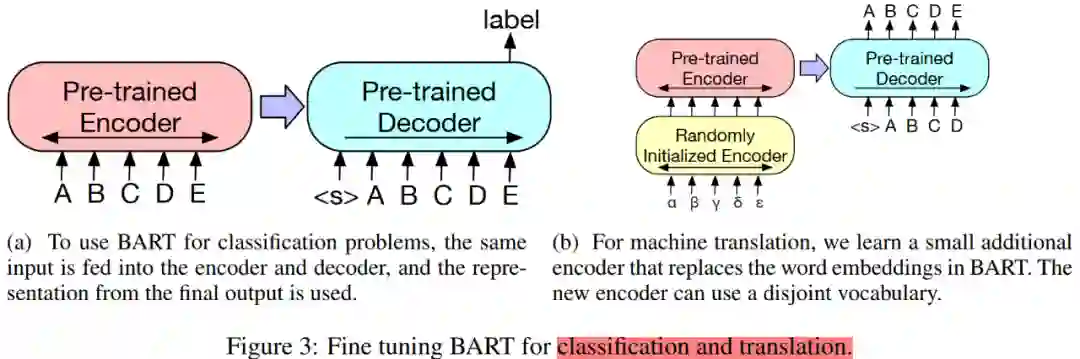 Figure 3中a:当使用 BART 解决分类问题,用相同的输入文本输入到encoder和decoder,使用最终输出的表征。b:对于机器翻译任务,训练一个额外的小型encoder来替换 BART 中的词嵌入。新encoder可使用不同的词汇。