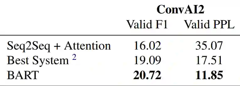 Table 5:BART 在对话生成任务上的性能优于之前的模型。其中困惑度基于 ConvAI2 官方 tokenizer 进行了重新归一化。