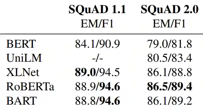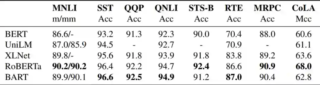 Table 3:BART的结果与XLNet和RoBERTa不相伯仲。