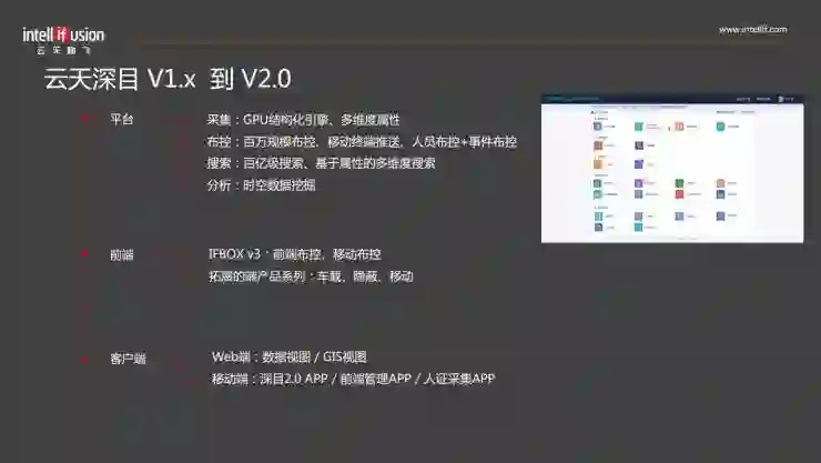 上图展示的是我们近期推出的深目2.0的系统。深目2.0的核心理念是以GIS地图为基准,让公安民警和指挥中心可以从上帝之眼的角度去俯视、管理整个城市;把人员轨迹、布控行为以及整个城市的分析、一人一档的分析映射到一个GIS地图上;把时空进行回溯,将时空、人、事件、物进行关联。并在这样一个地图的基础上,自动地去分析统计各类数据。
