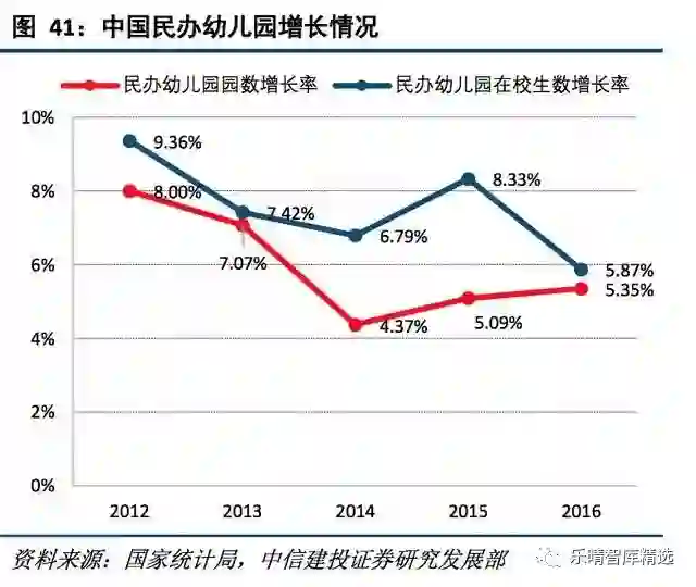 其中,2016年我国民办幼儿园在园人数2438万人,占比55%,较上年增速为5.87%,而民办园园数增长率更低为5.35%。
