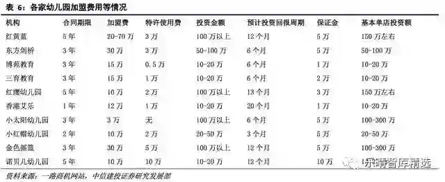 红黄蓝、红缨幼儿园基本单店投资额在150万左右,回报周期大概在一年。