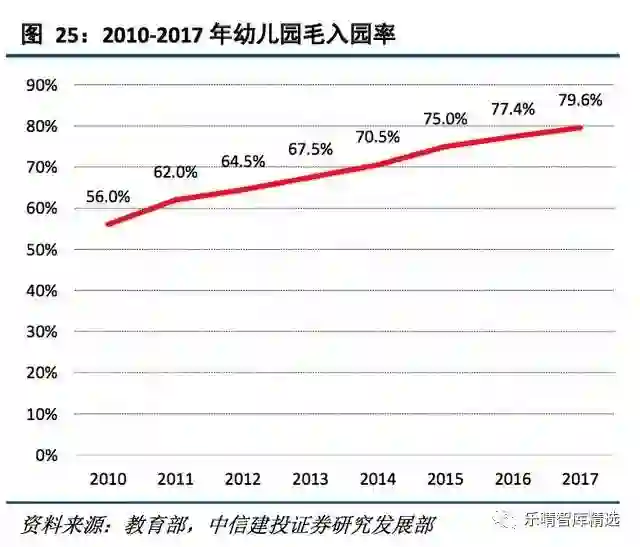 随着我国加大对学前教育的投入,2010年后我国学前教育毛入园率不断上升,到2017年末,我国学前教育入园率达到79.6%,较上年提高2.2个百分点。
