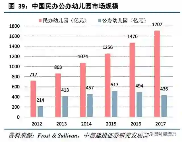 由于盈利性民办幼儿园可以自主定价,同时大量的民办幼儿园提供较为高档的设施条件和培育方式,收取的学费也相对较高,2017年民办市场达到1707亿元,是公办的近4倍,增速达16.12%。