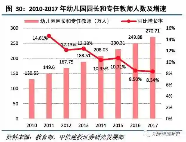 2017年估算全国幼儿园和专任教师总数为270.71万人,同比增速为8.34%。尽管增长明显,但实际上,我国学前教育师资数量缺口依旧较大。