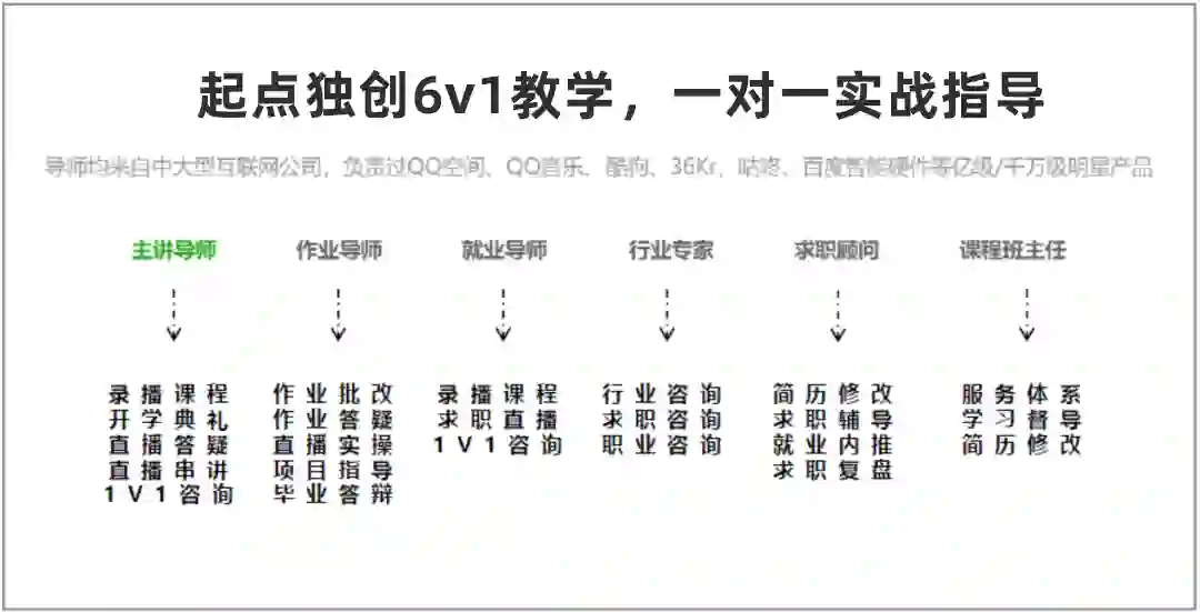 课程导师团集合了多位顶尖导师,他们均来自一线互联网大厂,配备了主讲导师、作业导师、就业导师、行业专家、班主任、助教等6个重要角色。