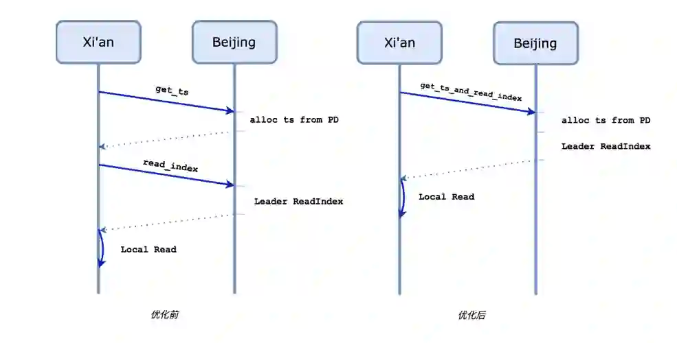 1. Follower Read Improvement 能将一个非交互式的读事务从 2RTT 降到 1RTT,但对于交互式的读事务,由于事先不知道涉及到事务的 Region,无法预读整个读请求中所有 Region read_index,因此只有第一次读请求和 get_tso 可以并行,将 n+1 RTT 优化到了 n RTT(n 为交互式事务中读语句的数量),而如果我们能将 ts 和 committed index 的对应关系找到,并且定期维护每个 Region 的 safe ts(小于该 ts 的事务一定已经 committed or aborted),那么我们就可以将交互式读事务的延迟也降低到 1RTT。