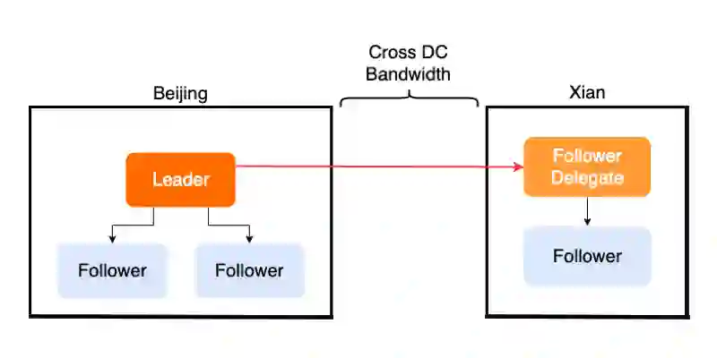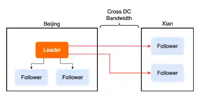 举个例子,生产环境中可能需要 5 个副本来保证可用性,假设 3 个副本在北京分别是 A B C,2 个在西安分别是 D E,同时 Leader 为 A,那么一条 Entry 需要北京的 Leader A,广播给西安的 DE,那么这次广播至少需要两次跨数据中心的网络传输,如下图所示。