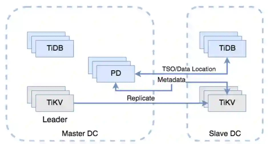 如下图所示,左右两边分别为两个数据中心,并且为了方便起见,如图 3 所示,左半部分为主数据中心(Master DC,假设在北京)TiKV 和 PD 的多数副本都部署在这里,并且很重要的是 Leader 会被固定在这里;图 3 右半部分为从数据中心(Slave DC,假设在西安)里面有 TiKV 和 TiDB。用户只会在主数据中心进行数据写入,但会在两边都进行数据读取。