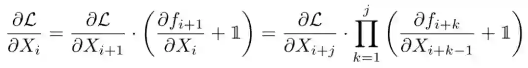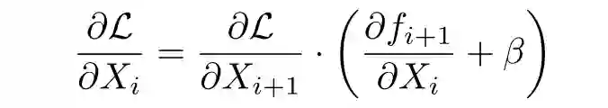 为了分析跳跃连接的作用,为所有的跳跃连接引入一个超参数 β,那么 Xi 的导数变为: