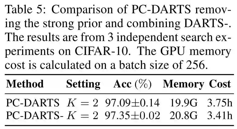 3. 本方法可以与其他 DARTS 的变体方法相结合。去掉人为先验后,在 CIFAR-10 数据集上本方法可分别将 P-DARTS [3] 和 PC-DARTS [4] 准确率再提升 0.8% 和 0.25%。