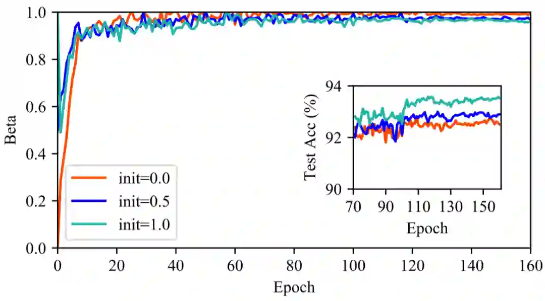 (2)对 ResNet50 的跳跃连接进行参数化训练。分别初始化 β 为 0,0.5 和 1.0,并绘制其变化曲线如下。可以看出,在 40 个 epoch 时,无论 β 初始值为多少,其都能收敛至1。因此,证明残差结构可以学习将 β 推向一个较大值来减轻梯度消失的问题。