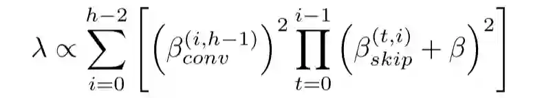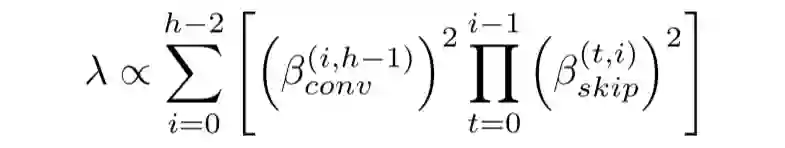 其中 h 表示超网的层数。从上式可以看出,相比于 βconv,λ 更加依赖于 βskip。当引入了额外的跳跃连接后,上式变为: