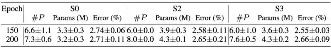 中提到使用更长的搜索轮数能使得超网更充分地收敛。而 DARTS 以及很多 DARTS 方法的变体在使用更长的搜索轮数时,会由于跳跃连接聚集而导致性能崩塌。为了验证该问题,我们将搜索轮数从 50 分别延长至 150 和 200。在 S0、S2 和 S3 三个搜索空间分别进行三次搜索实验,同时设置 β 只在最后 50 个 epoch 衰减。实验结果见下表。可以看出,经过更长的搜索轮数后,并没有出现明显的性能崩塌。我们同时也发现超网的收敛程度和搜索网络的性能之间的关系并不简单,尚待深入分析。