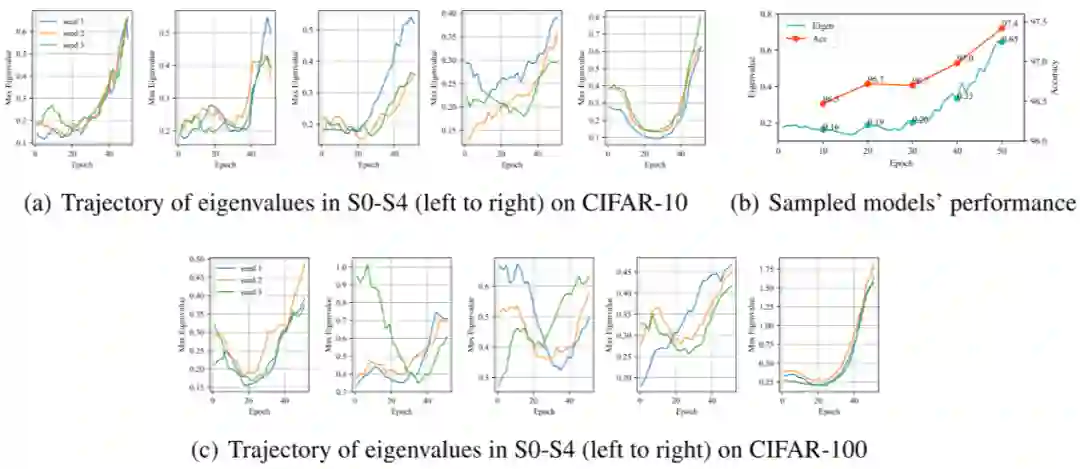1. DARTS- 搜索过程的特征根:优化过程中特征根(eigvenvalue)的增大,并不一定意味着模型性能会变差。以前方法用特征根作为性能崩塌的指示标志,我们找到了如图的几组反例。