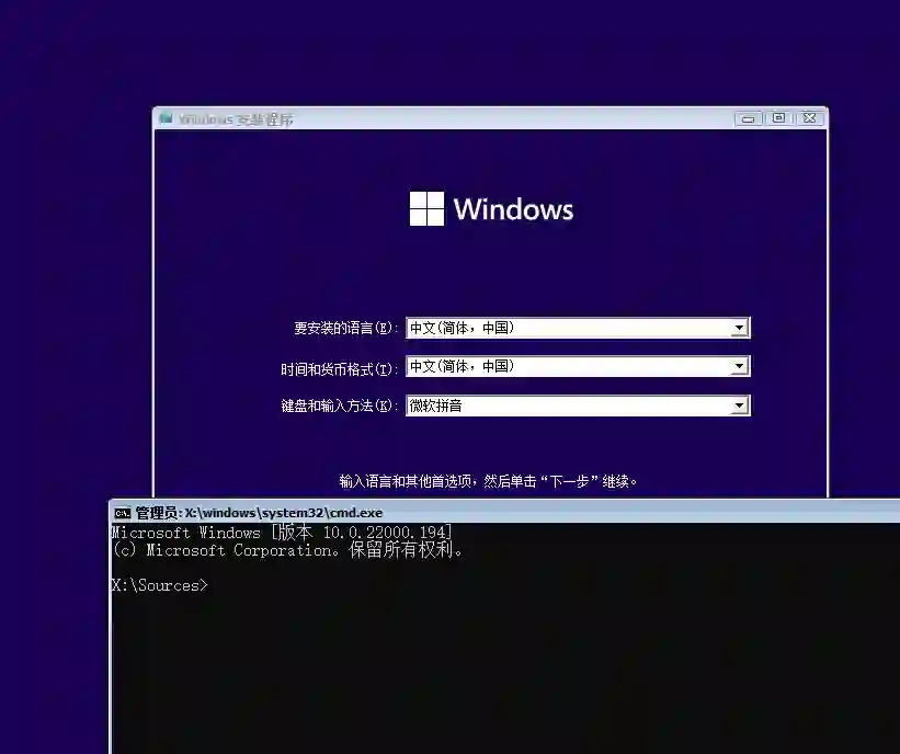如果类似上面的安装画面不能正常出现,只有一个黑屏界面和闪烁的光标;或是在不兼容的电脑上,想要不通过修改注册表的安装 Windows 11,我们依然可以通过之前烧录的 U 盘进行安装,不过这次我们需要使用到 CMD。