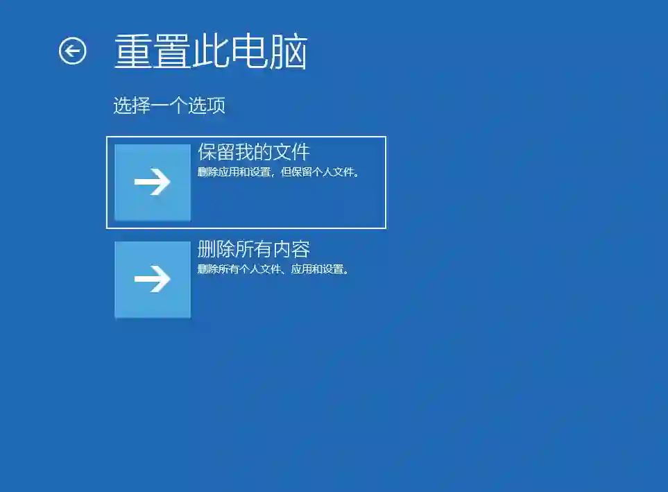 如果电脑这时以及无法进入系统,那么可以在开机时(出现 Windows Logo 以前)按住 F8 不放进入「高级启动选项」,选择「疑难解答-重置此电脑」即可。