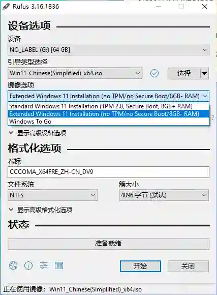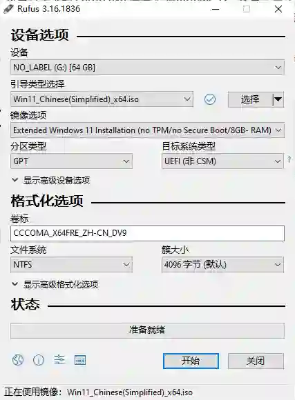 相比以往烧录 Windows 系统安装镜像,rufus 针对 Windows 11 镜像可以做进一步的烧录定制,尤其是对于此前不符合硬件兼容标准的硬件,现在可以通过将「镜像选项」调整为 「Extended Windows 11 Installation」来跳过硬件兼容性检查,当然如果你之前就是正常安装,那么这一项直接选择「Standard Windows 11 Installation」即可。其他功能设置项不动,然后点击开始就可以执行安装镜像的烧录了。