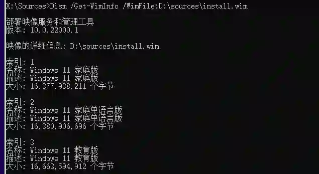 Dism /Apply-Image /ImageFile:D:\sources\install.wim /Index:系统索引号 /ApplyDir:C:\