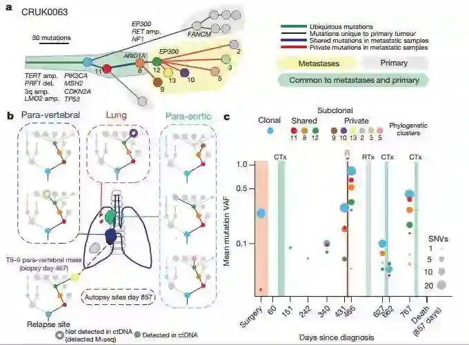 研究者设计了一个ctDNA assay panel以回顾性追溯该肿瘤的转移亚克隆负荷,每个时间点检测103个SNV。术后151天时检测出其中2个克隆SNV;术后242天时检测出一个新的亚克隆SNV,即图中的聚类8;术后466天时,出现胸椎旁转移灶,此时共有聚类8、11、12包含的的20个亚克隆SNV中,血浆ctDNA中可检出的18个,另包括特有聚类5、9中的2个亚克隆SNV。然而,术后467天时椎旁转移灶活检组织中并未检测出上述亚克隆SNV。由此可见,血浆ctDNA所提示的亚克隆SNV层级负荷,与原发灶多点测序的系统进化推断相一致。克隆SNV的VAF在术后姑息放化疗中有所降低,但在术后767天时开始升高。死亡前90天时,血浆ctDNA才能够检测的聚类5、9和2中的其余SNV;而这三组聚类中的SNV属于主动脉旁转移灶所特有的亚克隆。