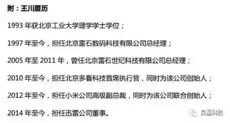 王川和雷军是多年好友,也是一位连续创业者。2010年王川创办多看阅读;2012年该公司被小米收购,王川成为小米联合创始人。2012年多看发开出小米盒子。2013年推出第一代小米电视。2014年,王川加入迅雷董事会。