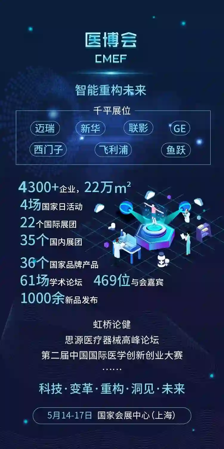 未来已来,智能重构未来。以人工智能为核心的“智能技术”正成为医疗健康领域又一次重构与变革的开端。从人工智能对医疗行业生产力的提高、生产方式的改变到底层技术的驱动、再到医学诊断流程的优化、应用场景的不断拓展,各类智能技术正在以惊人的速度席卷医学健康的各个角落。CMEF作为全球医疗科技创新的“大本营”,致力持续发挥平台引领、创新、赋能、融合、共创、共享、共赢的价值理念和品牌影响力,以行业需求为导向,以科技创新为宗旨,携手实现跨越式大发展全球健康梦!2019年5月14-17日上海国家会展中心,更多CMEF现场亮点,等你来发现!