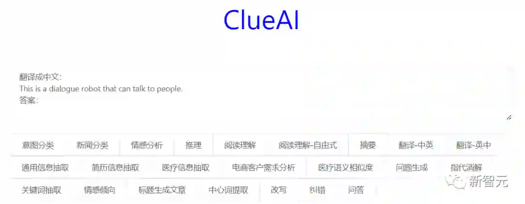 意图分类, 新闻分类, 情感分析, 自然语言推理, 阅读理解, 阅读理解-自由式, 摘要, 翻译-中英, 翻译-英中, 通用信息抽取, 简历信息抽取, 医疗信息抽取电商客户需求分析, 医疗语义相似度, 问题生成, 指代消解, 关键词抽取, 情感倾向, 根据标题文章生成, 知识图谱问答, 相似句子生成/改写, 纠错, 中心词提取.....
