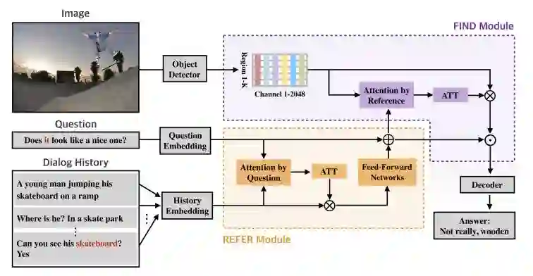相反,FIND采用图像特征和参考感知表示输入(REFER模块的输出),并通过实施自下而上的注意技术实现视觉接地。在VisDial v1.0和v0.9数据集上对DAN的定量和定性评估表明,它在很大程度上优于现有的可视对话模型。