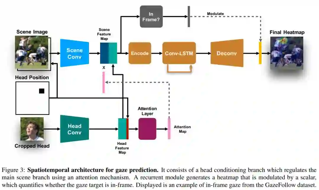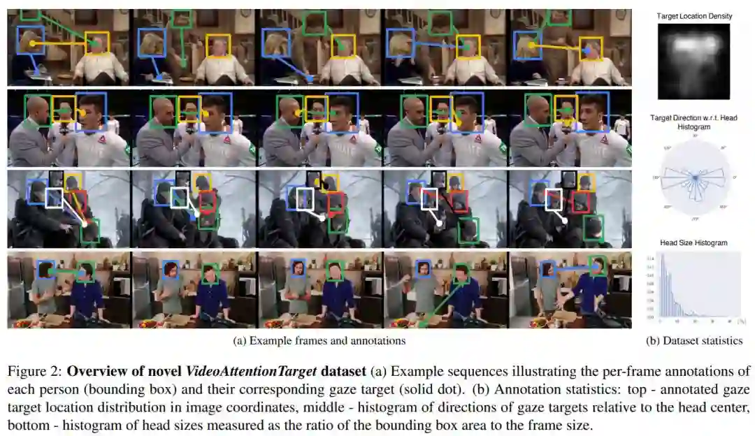 这篇论文被CVPR 2020接收,要解决的是检测视频中关注目标的问题。具体来说,目标是确定每个视频帧中每个人的视线,并正确处理帧外(的情况。所提的新架构有效模拟了场景与头部特征之间的动态交互,以推断随时间变化的关注目标。同时这篇论文引入了一个新数据集VideoAttentionTarget,包含现实世界中复杂和动态的注视行为模式。在该数据集上进行的实验表明,所提模型可以有效推断视频中的注意力。为进一步证明该方法的实用性,这篇论文将预测的注意力图应用于两个社交注视行为识别任务,并表明所得分类器明显优于现有方法。